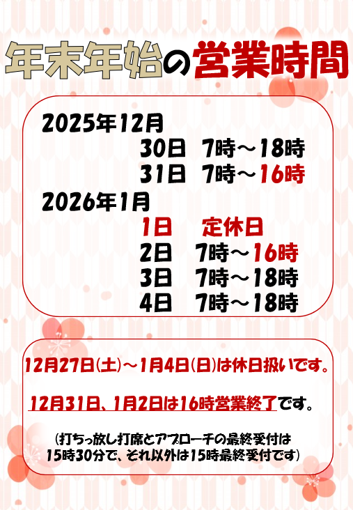 | 2025.09.05 | 本日、台風接近に伴いクローズ致します。 |