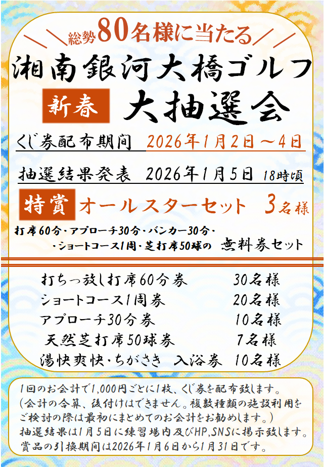 | 2025.01.06 | 本日、雨天のためクローズ致しました。また明日以降のご来場をお待ちしております。 |